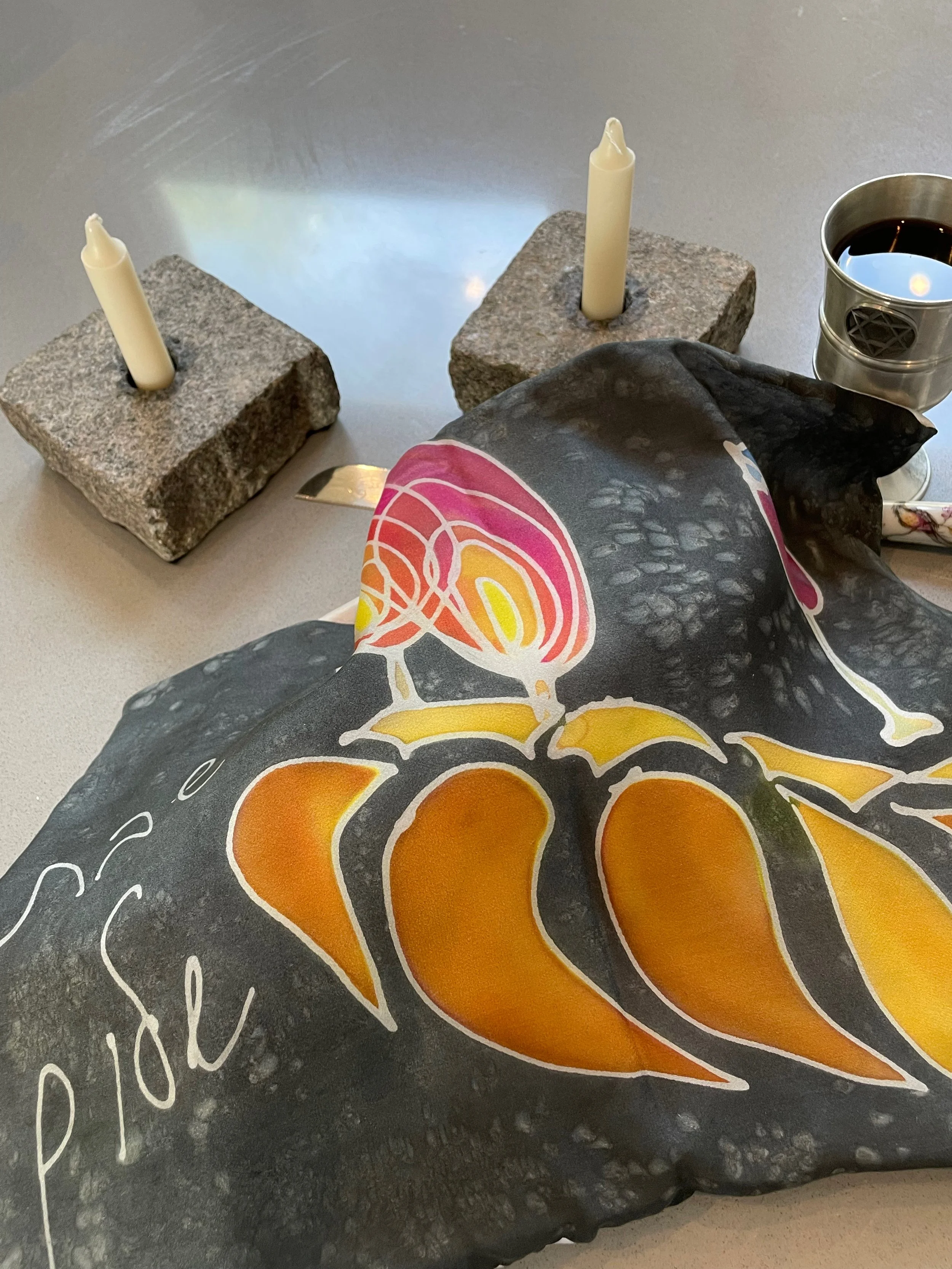 This hand painted silk Challah Cover features Shabbat wine, lit candles and a beautiful Challah. The background is painted to a speckled appearance.
